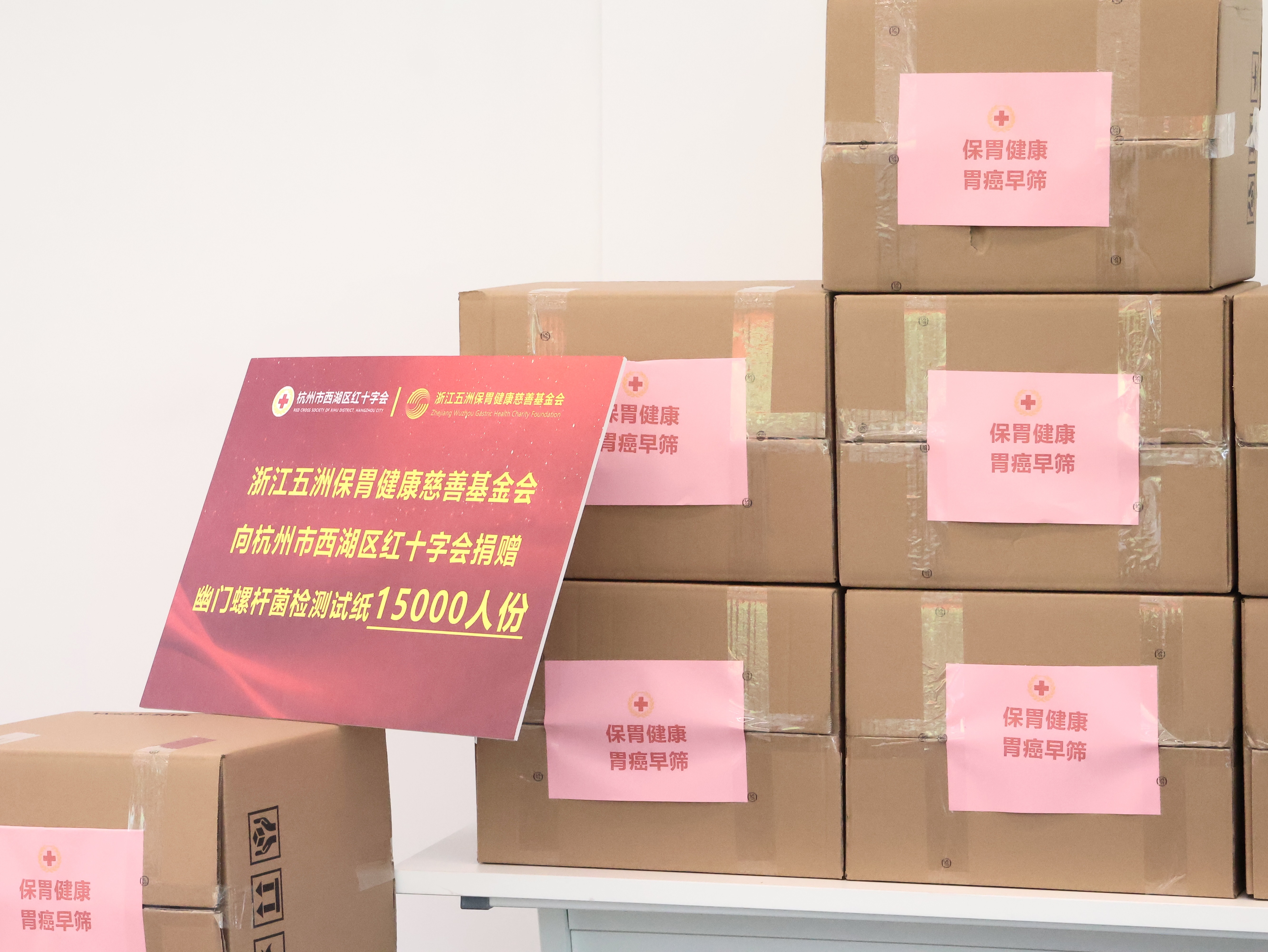 為助力“健康西湖”建設(shè),推動(dòng)胃癌早篩行動(dòng),2024年4月25日上午,浙江五洲保胃健康慈善基金會(huì)特向杭州市西湖區(qū)紅十字會(huì)捐贈(zèng)15000份HP試紙。